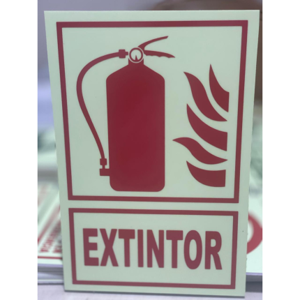 Señal de seguridad en vinil fotoluminiscente sobre base Celtex 3 mm, con vinil rojo ploteado (no impreso) y cinta doble contacto para instalación en pared.